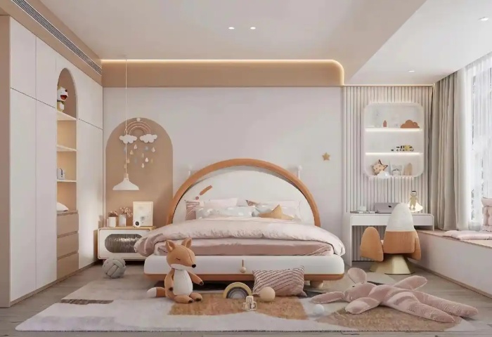 2、睡眠區(qū)是兒童房的重要組成部分。選擇一張舒適的床對(duì)于孩子的睡眠質(zhì)量至關(guān)重要。床的尺寸要適合孩子的年齡和身高,同時(shí)要保證床墊的質(zhì)量,以提供良好的支撐??梢栽诖策叿胖靡粋€(gè)柔軟的地毯,讓孩子起床時(shí)不會(huì)感到冰冷。此外,還可以為孩子選擇一些可愛的床上用品,增加房間的溫馨感。青島裝修公司,就選東方家園裝飾!