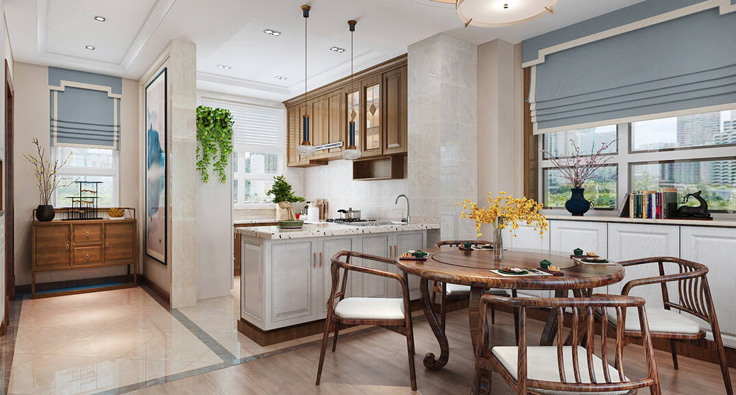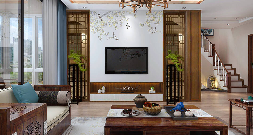 一般采用"啞口"或簡約化的"博古架"來區(qū)分;在需要隔絕視線的地方,使用中式的屏風或窗欞,通過這種新的分隔方式,展現(xiàn)出中式家居的層次之美。