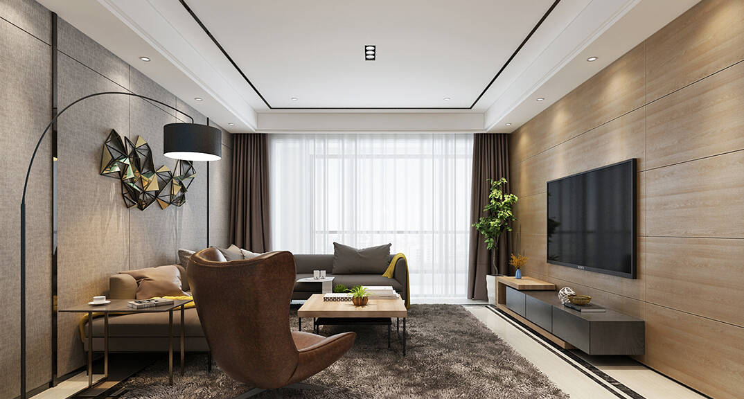 客廳體現(xiàn)了主人的品味,地位,也是交友娛樂的場合,影視墻凹凸線條的護(hù)墻板很好的隱藏了孝親房的門讓整個(gè)空間融為一體。