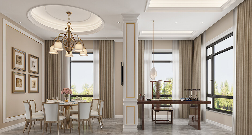 海信千畝園240㎡三室兩廳餐廳書(shū)房美式輕奢風(fēng)格裝修案例效果圖