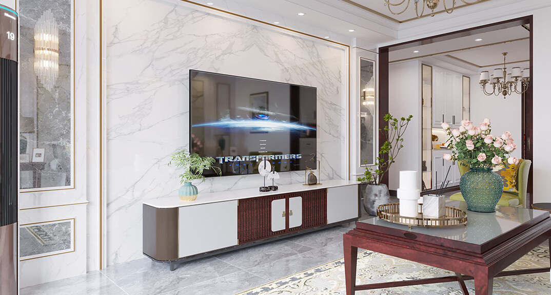 客廳采用簡潔的石膏裝飾線條吊頂,搭配精致的吊燈,營造出一種浪漫的感覺。以大理石作為電視背景墻和地面裝飾材料,光澤感極佳,在沙發(fā)區(qū)鋪上大幅棕灰色地毯,使空間區(qū)域劃分更加清晰。沙發(fā)運(yùn)用灰色調(diào)與地面顏色相呼應(yīng),拉大了空間感,搭配白色的墻面,襯托出獨(dú)具一格的知性魅力。