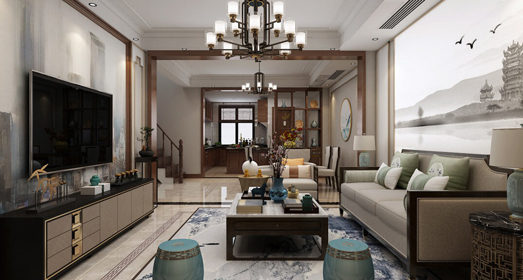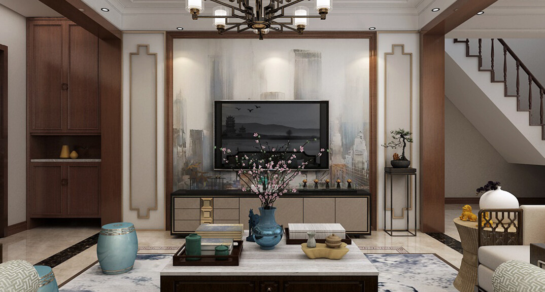 楓林小鎮(zhèn)230㎡別墅客廳電視新中式風(fēng)格裝修案例效果圖