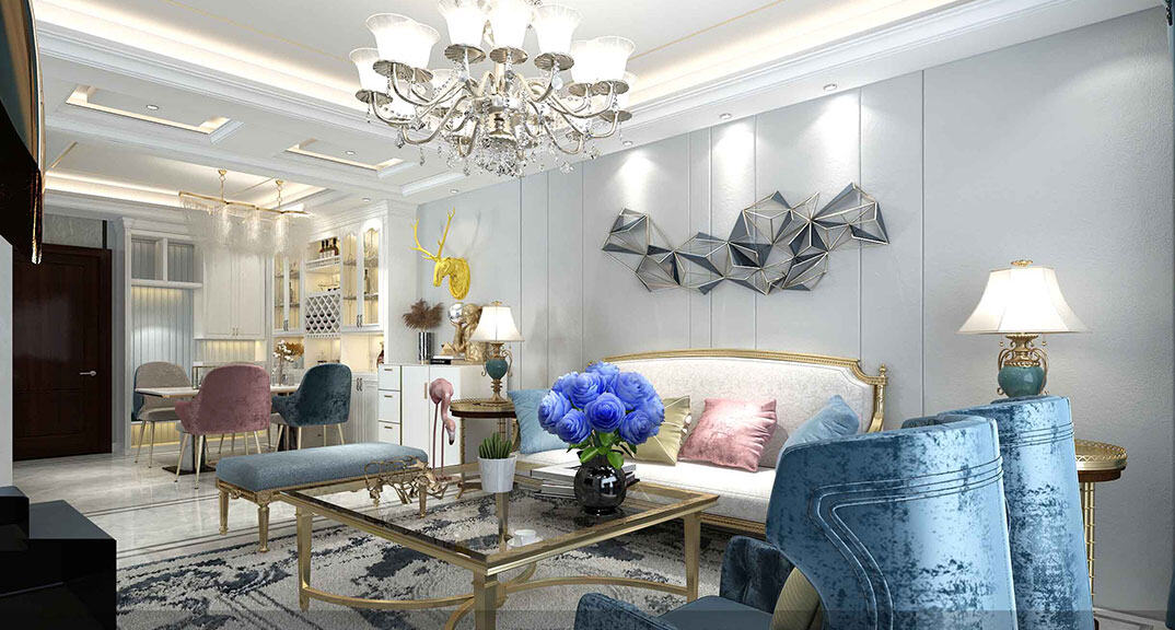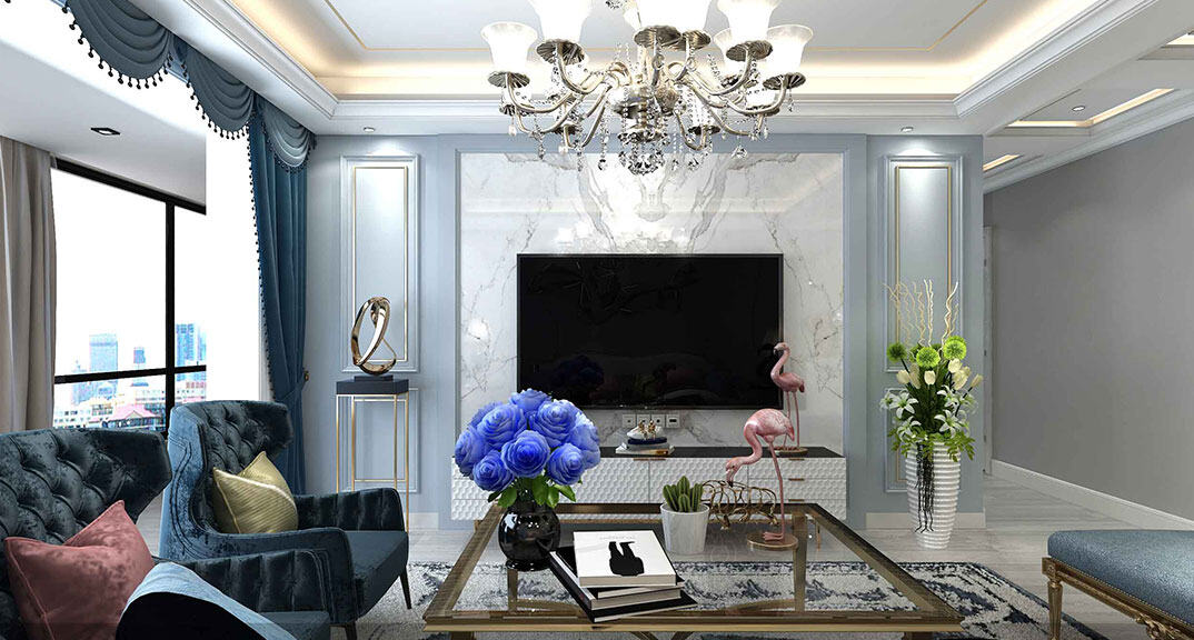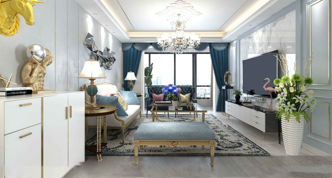安泰德園130㎡復(fù)式客廳電視美式輕奢風(fēng)格裝修案例效果圖