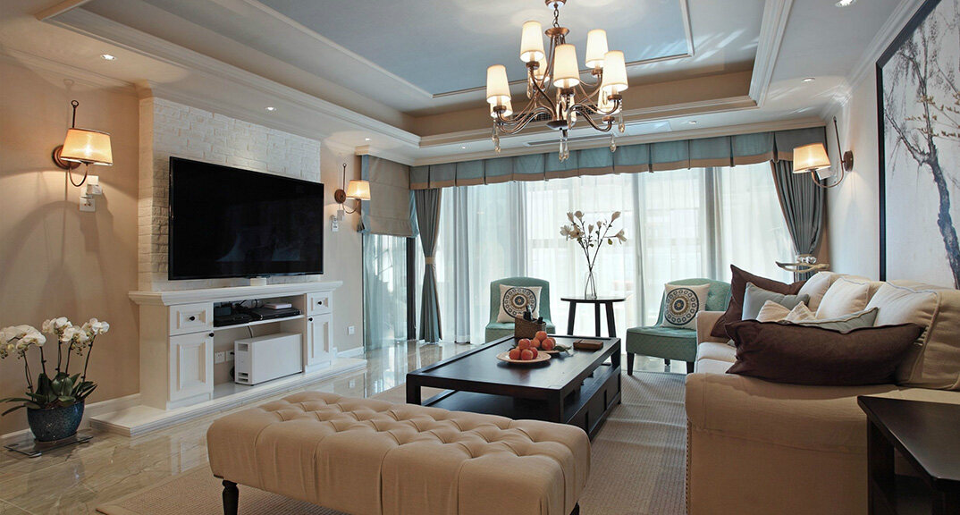 檀府300㎡別墅客廳現(xiàn)代美式風格裝修案例效果圖