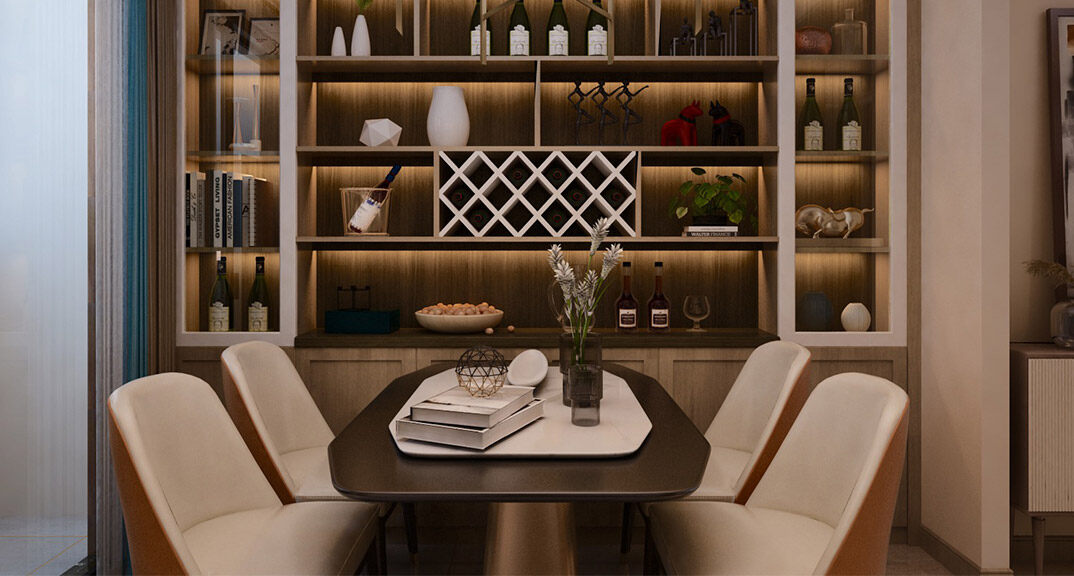 簡約風(fēng)格的特點(diǎn)是將設(shè)計(jì)的元素,色彩,照明,原材料簡化到最少的程度但對色彩,材料的質(zhì)感要求很高,因此,簡約的空間設(shè)計(jì)通常非常含蓄,往往能達(dá)到以少勝多,以簡勝繁的效果。此居室整體采用中性色調(diào),穩(wěn)重,大氣,卻又不失品味,令人眼前一亮的感覺。餐廳柜子以灰色,加上木飾面的點(diǎn)綴。分割出恰當(dāng)?shù)谋壤院啙嵉脑煨?,完美的?xì)節(jié),延續(xù)整個(gè)風(fēng)格的特點(diǎn),使個(gè)空間顯得簡潔大氣。