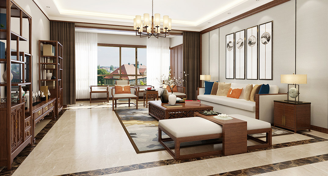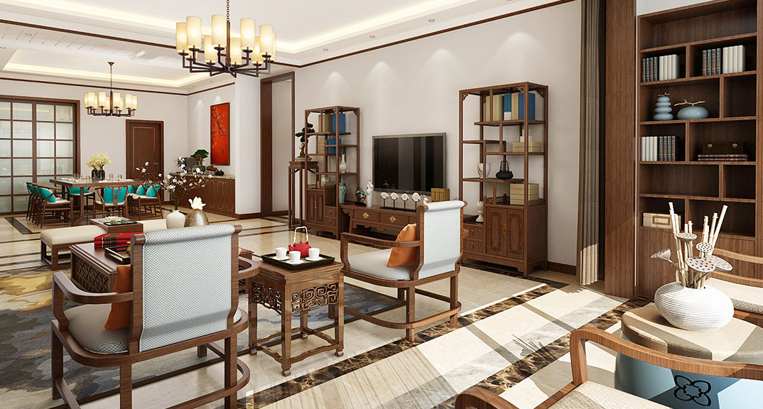 市直三區(qū)260㎡平層客廳新中式風(fēng)格裝修案例效果圖
