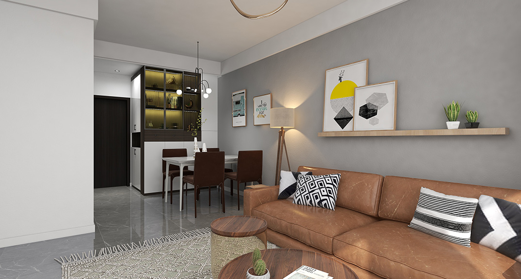 簡約中有一種高級感,造型簡約的沙發(fā)放著靠枕進行搭配,多邊形的茶幾上放著精致的擺件,看起來很有質感,客廳整體給人一種簡約高雅的感覺。
