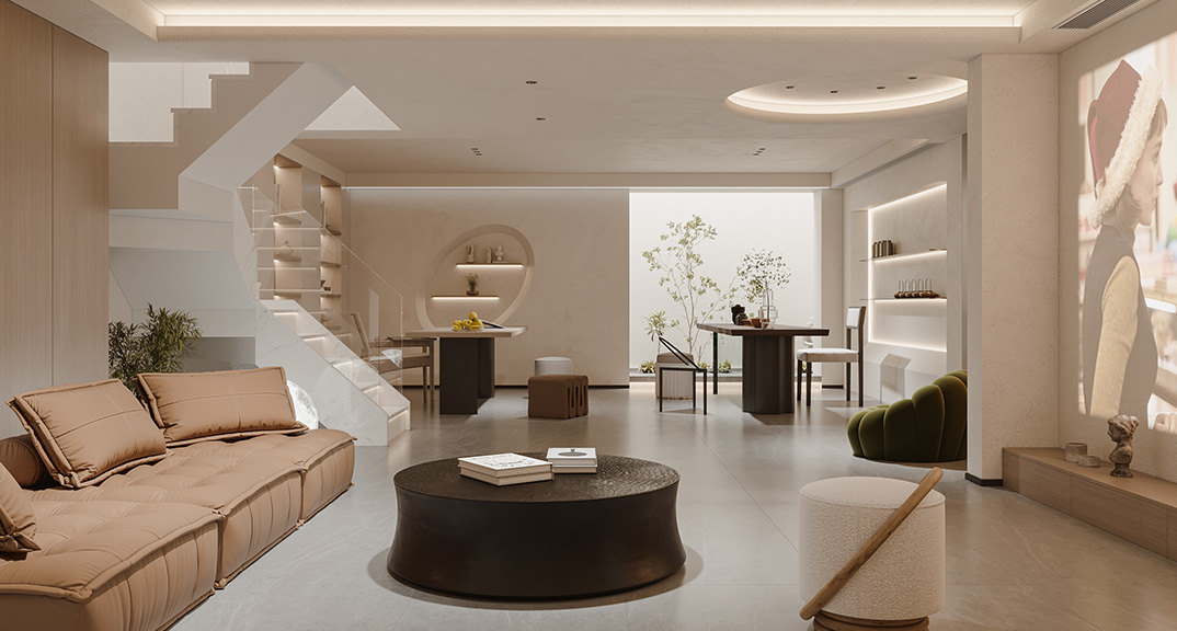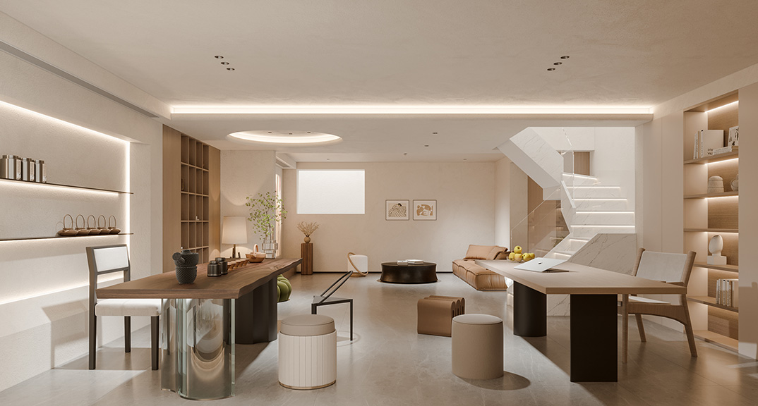 紫荊閣300㎡別墅下疊客廳茶室新中式風(fēng)格裝修案例效果圖