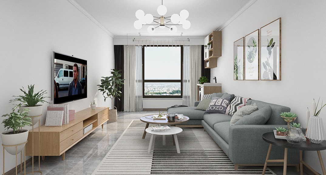 保利時(shí)代98㎡三室兩廳客廳原木風(fēng)戶型研發(fā)效果圖