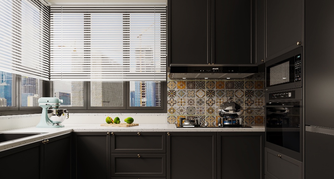 原始戶型廚房空間很寬敞,衛(wèi)生間想要把洗手盆拿出來(lái),占用廚房的空間。因加裝電梯,廚房多出來(lái) 1.5 米的空間,這樣也不影響整體尺寸。