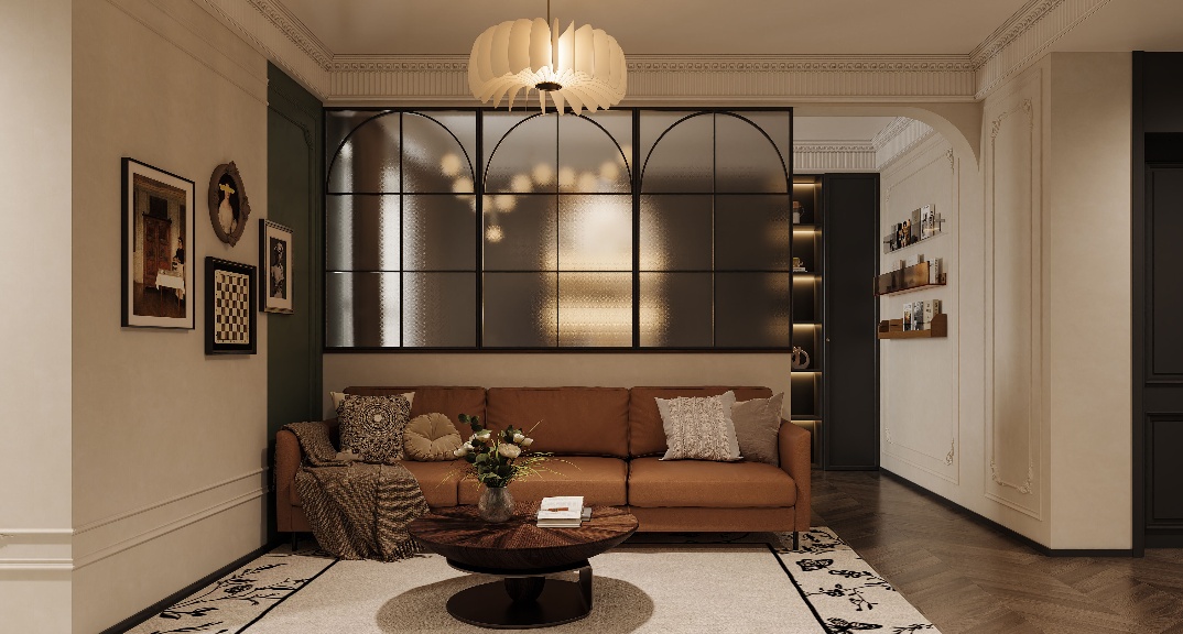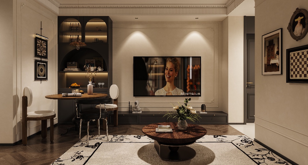 客戶需要書(shū)房,考慮到客廳的尺寸,決定在沙發(fā)上后側(cè)作為獨(dú)立的讀書(shū)區(qū),既能中和沙發(fā)和電視之間的距離,也可以增加空間的趣味性,用玻璃間隔做到了隱私性和透光性同時(shí)兼顧。
