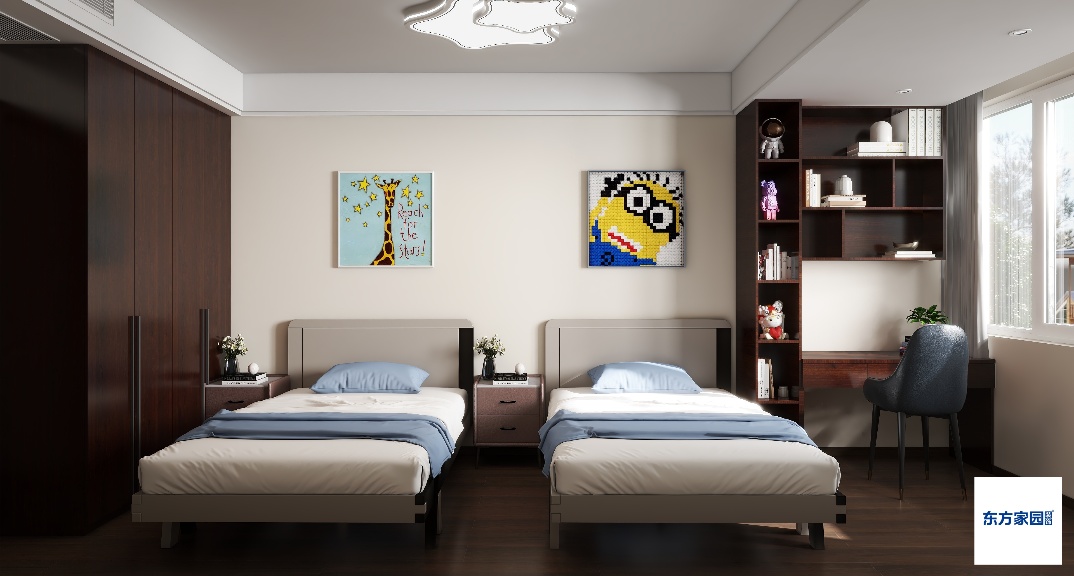 客戶收納多給他主臥做了一排長(zhǎng)柜子,有兩個(gè)孩子不要上下鋪,由于空間足夠兩張成品床,分別做兩個(gè)獨(dú)立書桌,互不干擾,要求要新中式風(fēng)格,動(dòng)線流暢,布局合理。