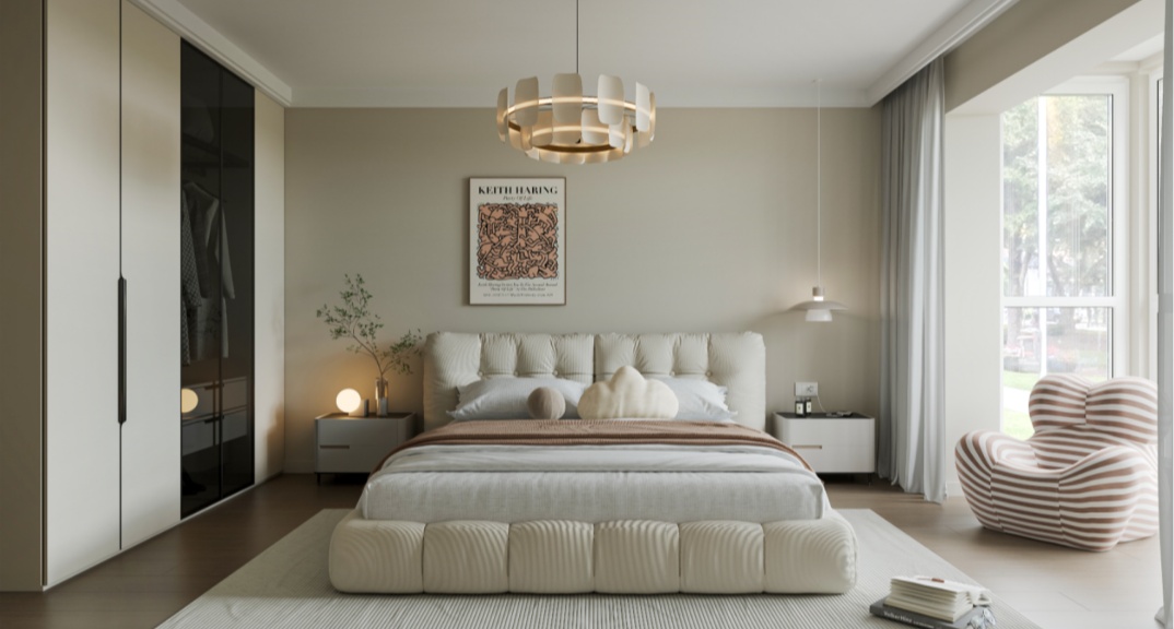 以中性色為主,搭配柔和的色彩點(diǎn)綴,營造寧靜而不失活力的空間氛圍。柔和的色調(diào)和質(zhì)感材料,打造寧靜的睡眠環(huán)境。墻面上以簡(jiǎn)潔的裝飾畫和藝術(shù)品點(diǎn)綴墻面,增加空間的藝術(shù)感。