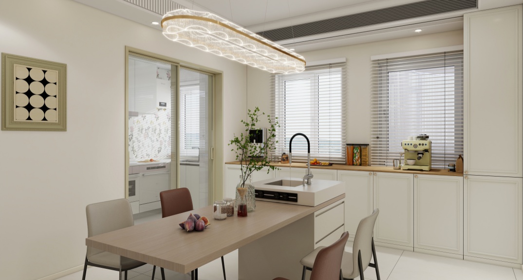 2.原來客廳區(qū)域較別扭,沒有完整電視墻及沙發(fā)墻,且客戶喜歡制作餐點,喜歡島臺設(shè)計,想要大量收納及一個西廚區(qū),現(xiàn)將原來客廳區(qū)域規(guī)劃為西廚區(qū),做了餐島一體,增加了收納功能,客廳放到原來餐廳區(qū)(及擴(kuò)出來的區(qū)域)